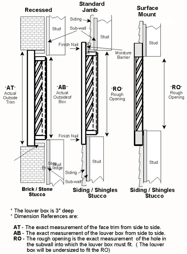 | Vent Types: | Standard Jamb Surface Mount/Closed Louver Surface Mount/ Open Louver "Surface Mount" means that the vent is made to mount on the wall without any louver box extending out the back of the unit. "Standard Jamb" means that the vent has a 3" deep louver box extending out the back of the unit. Includes screening. |