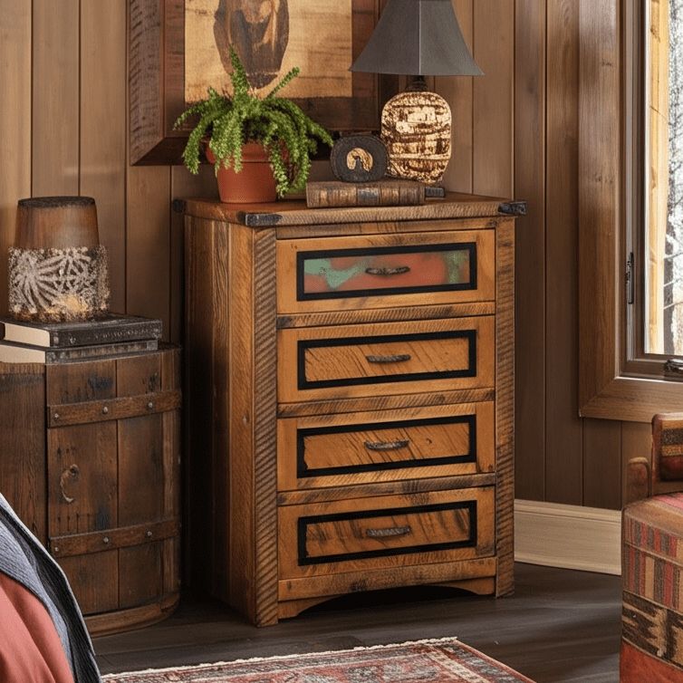 | Decorative Details: | Corner Accent & Handles made of a heavy duty hammered iron Drawer Fronts feature a Black Painted Trim Piece Copper Inlay (Patterns & Colors vary and will not appear exactly as photographed.) (Option to add inlay to remaining drawer fronts.) |