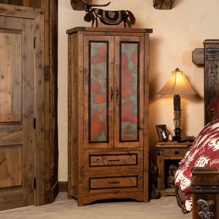 Decorative Details: | Corner Accent & Handles made of a heavy duty hammered iron Drawer & Door Fronts feature a Black Painted Trim Piece Copper Inlay (Patterns & Colors vary and will not appear exactly as photographed.) (Option to add inlay to drawer fronts.) |