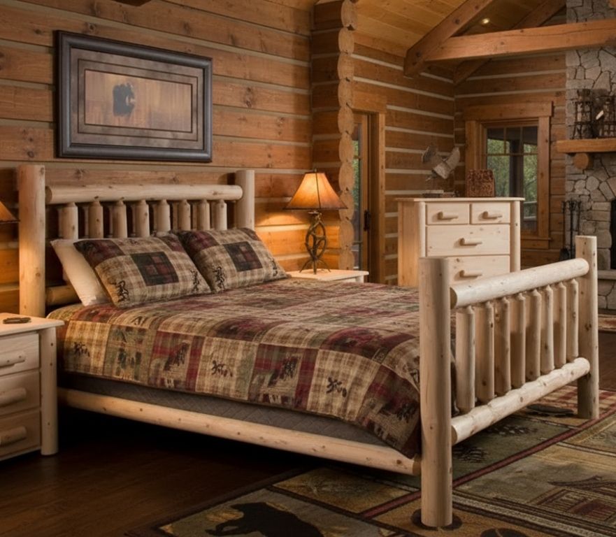 | Dimensions: | Twin Bed: 88"L x 48"H x 42"W Double Bed: 88"L x 48"H x 56"W Click to see Line Drawing Queen Bed: 93-95"L x 48"H x 65"W King Bed: 93-95"L x 48"H x 80"W Click to see Line Drawing Additional Dimensions (All Sizes): Footboard Heigh - 36.25" From Floor to bottom of Side Rail - 6" Length of the bed can vary based on the size of logs that are used for the headboard and footboard. Range of potential length is indicated above. |